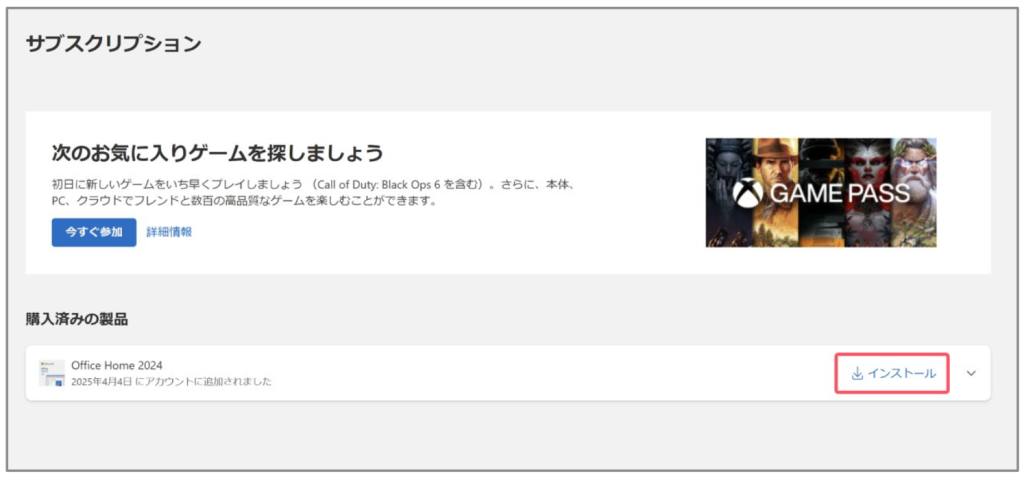 「購入済みの製品」から「Office Home 2024」を見つけて「インストール」ボタンをクリックします。