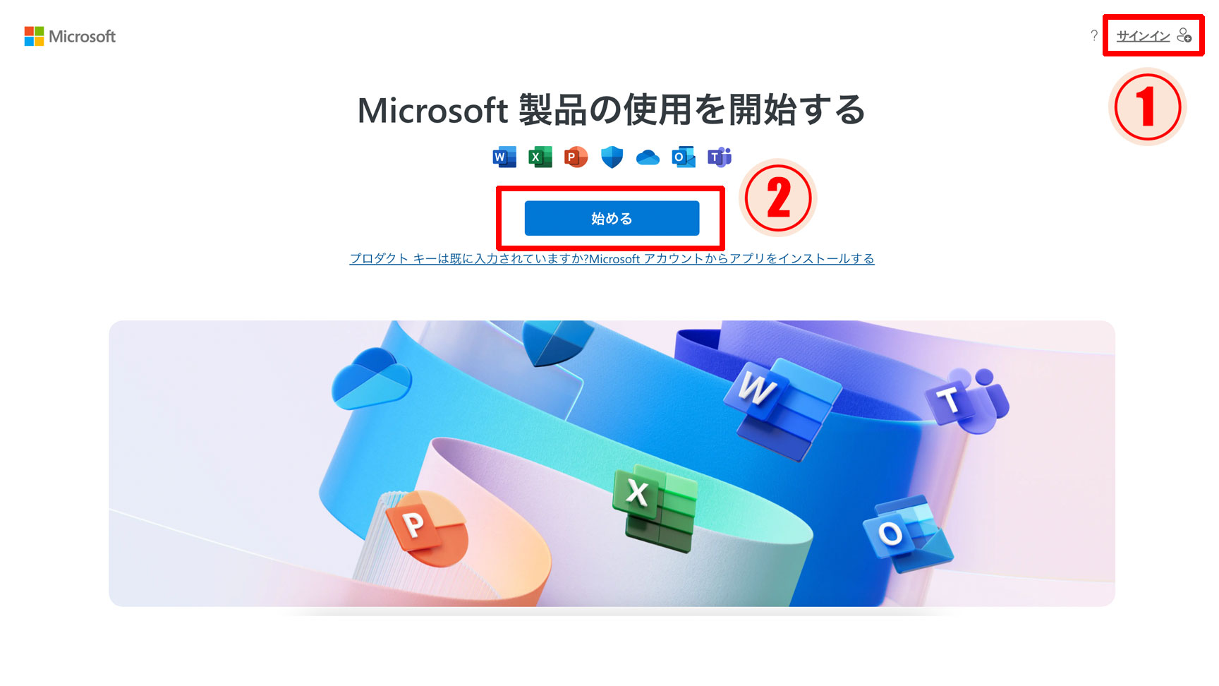 はじめにMicrosoft 公式ダウンロードページ「https://setup.office.com/」をクリックして、Microsoft Office のダウンロード ページにアクセスしましょう。