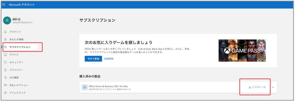 マイクロソフトアカウントの「サブスクリプション」をクリックするとMicrosoft Office Home and Business 2021 for Macがセットアップされています。