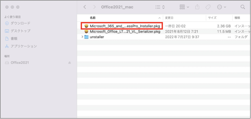 ダウンロードが完了したら検索を開き、[ダウンロード] に移動して Microsoft_365_and_Office_16.xxxxx_BusinessPro_Installer.pkg をダブルクリックします (名前は多少異なることがあります)。