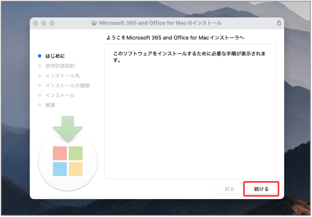 最初のインストール画面で、[続行する] を選んで、インストール プロセスを開始する。