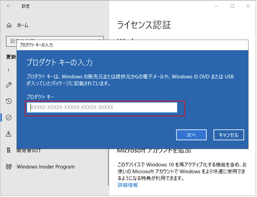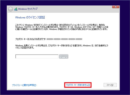 (3)ここでプロダクトキー(25文字)を入力して、「次へ」をクリックすることでWindows 10のライセンス認証を行いましょう。