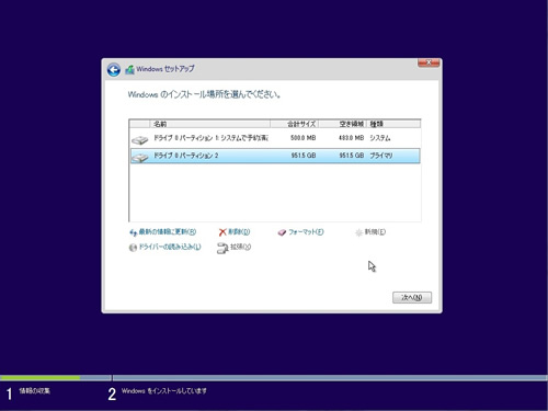 ウインドウ右下の「ドライブオプション(詳細)(A)」をクリックしますと、下記のような画面に変わります。 Windows 10 が インストール されているパーティション(下記の場合は951.5GBのドライブ0パーティション2)にカーソルを合わせて「削除(D)」をクリックします。 削除をするかどうか確認の画面が表示されますので「はい」をクリックします。 次に「システムで予約済み」と書かれているパーティション(下記の場合は500MBのドライブ0パーティション1)に合わせ、同様に削除を実行します。