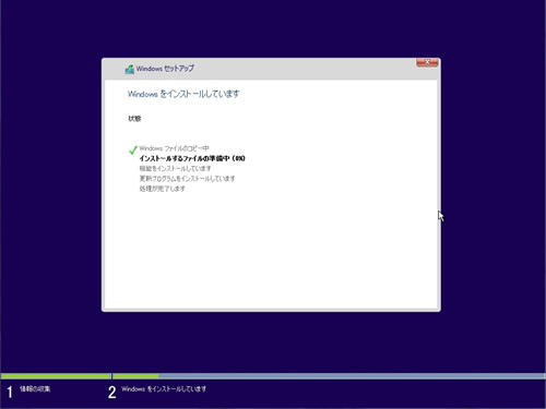 Windows 10 のインストール画面となり、数十分間はUSB(DVDドライブ)からHDDへファイルがコピーされ インストール が進みます。 インストール途中、数回再起動されますがその間は何もしないでください。