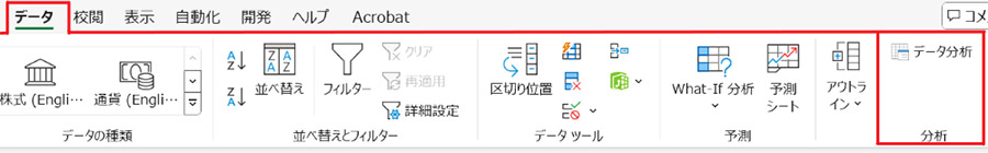 この設定が完了すると、「データ」タブの右側に「データ分析」というボタンが表示されます。