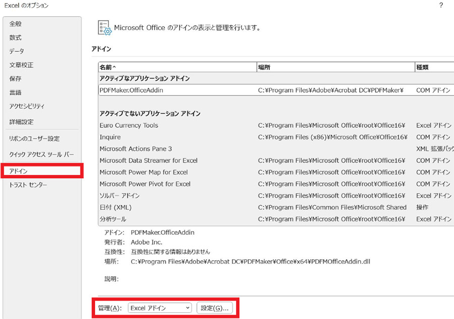 4.画面下部の「管理」欄で「Excel アドイン」が選択されていることを確認し、「設定」をクリックします。